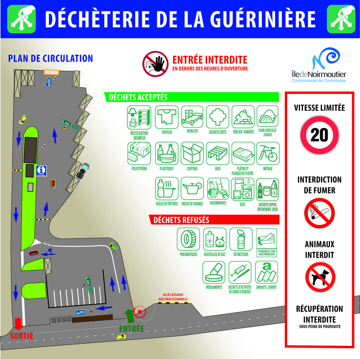 La déchèterie se situe au centre de l’île sur la commune de la Guérinière dans la ZA des mandeliers, rue de la Prée au Duc, derrière Intermarché. Elle est accessible à tous les usagers du territoire et les dépôts sont gratuits pour les particuliers, sans limite d’apport.